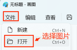 步骤二:点击左上角的“文件”选项,选择“打开”并导入需要转换的图片。