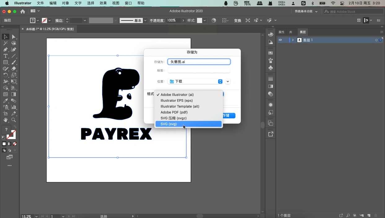步骤三: 转换完成后,再次点击“文件”菜单,选择“存储为”或“导出”。在保存类型的对话框中,选择“SVG (*.SVG)”格式。