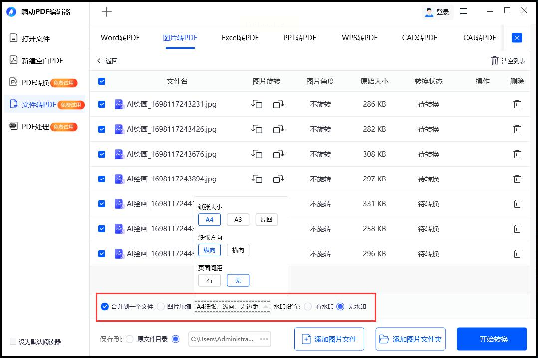 3. 设置转换参数:在界面下方可以设置输出路径、页面大小(比如A4、A3等)、图片压缩方式,还能添加水印或调整图片方向。如果不需要特殊设置,保持默认也可以。
