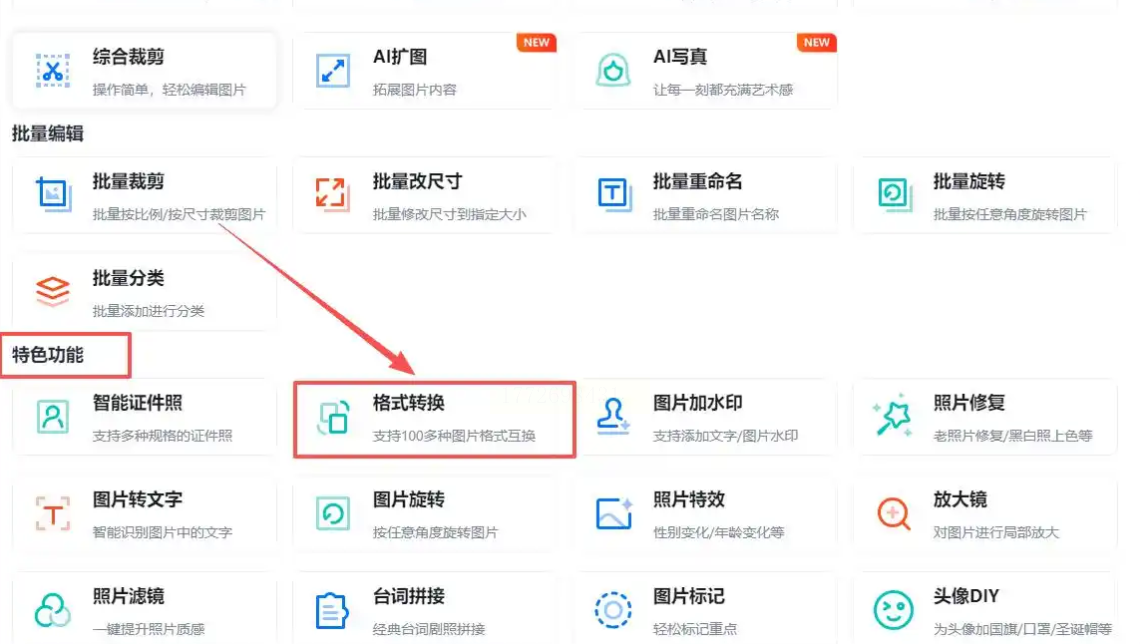 1️⃣ 专业功能区整合:打开软件首页就能看到“特色功能”,点进去选中【格式转换】,比单独开图片编辑器快