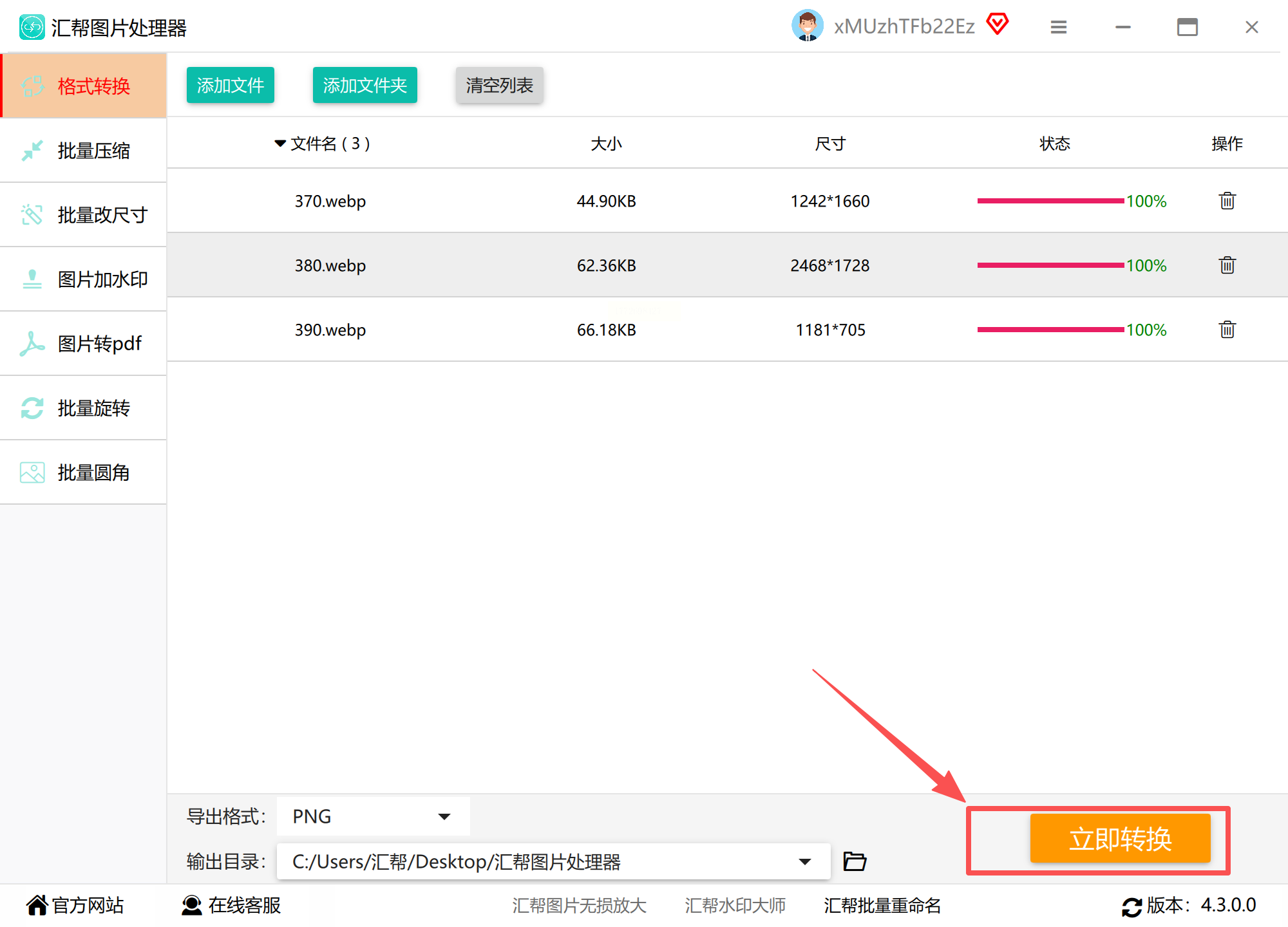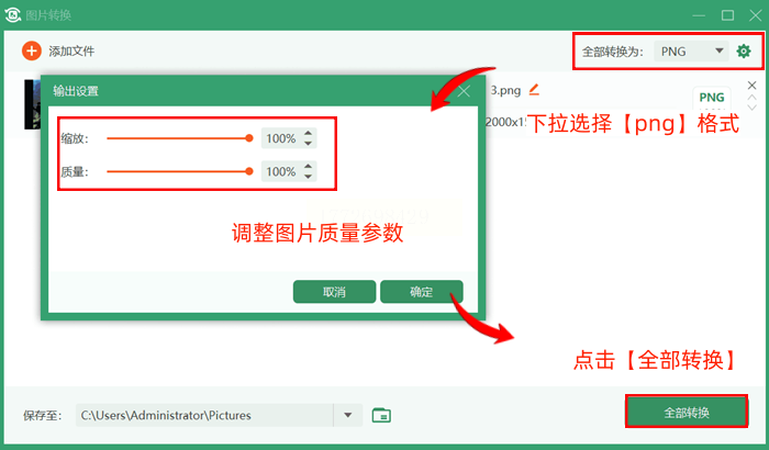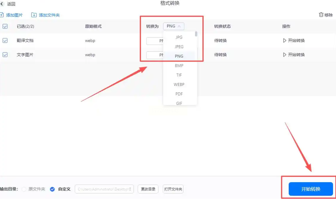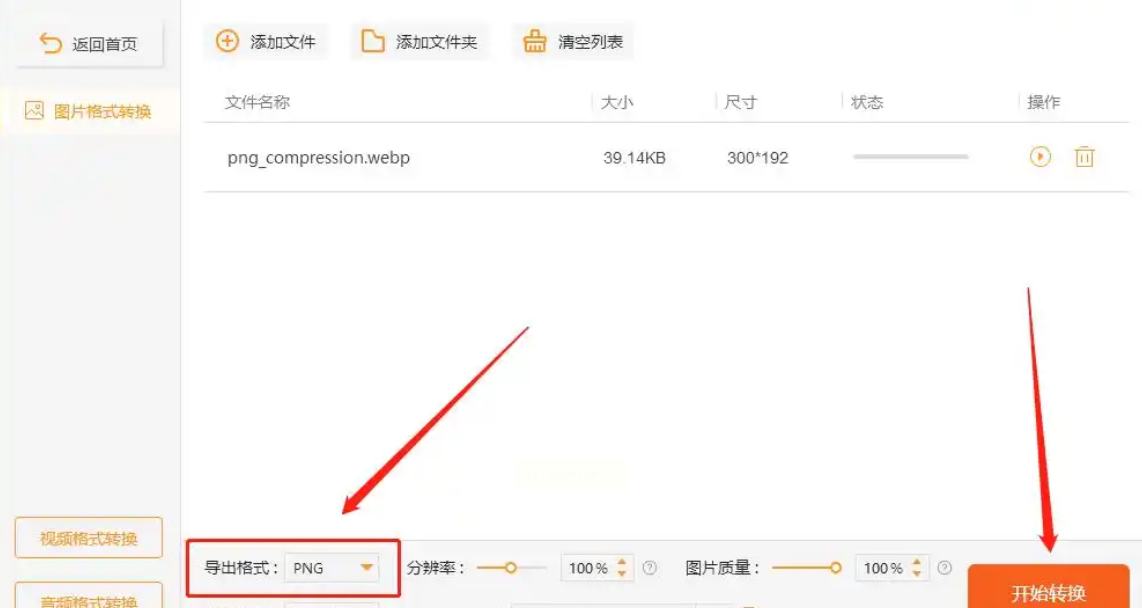 2️⃣ 导出按钮巨醒目:下方橙色的【开始转换】按钮特别亮,选好PNG格式后点一下就开始,比手动添加快多了