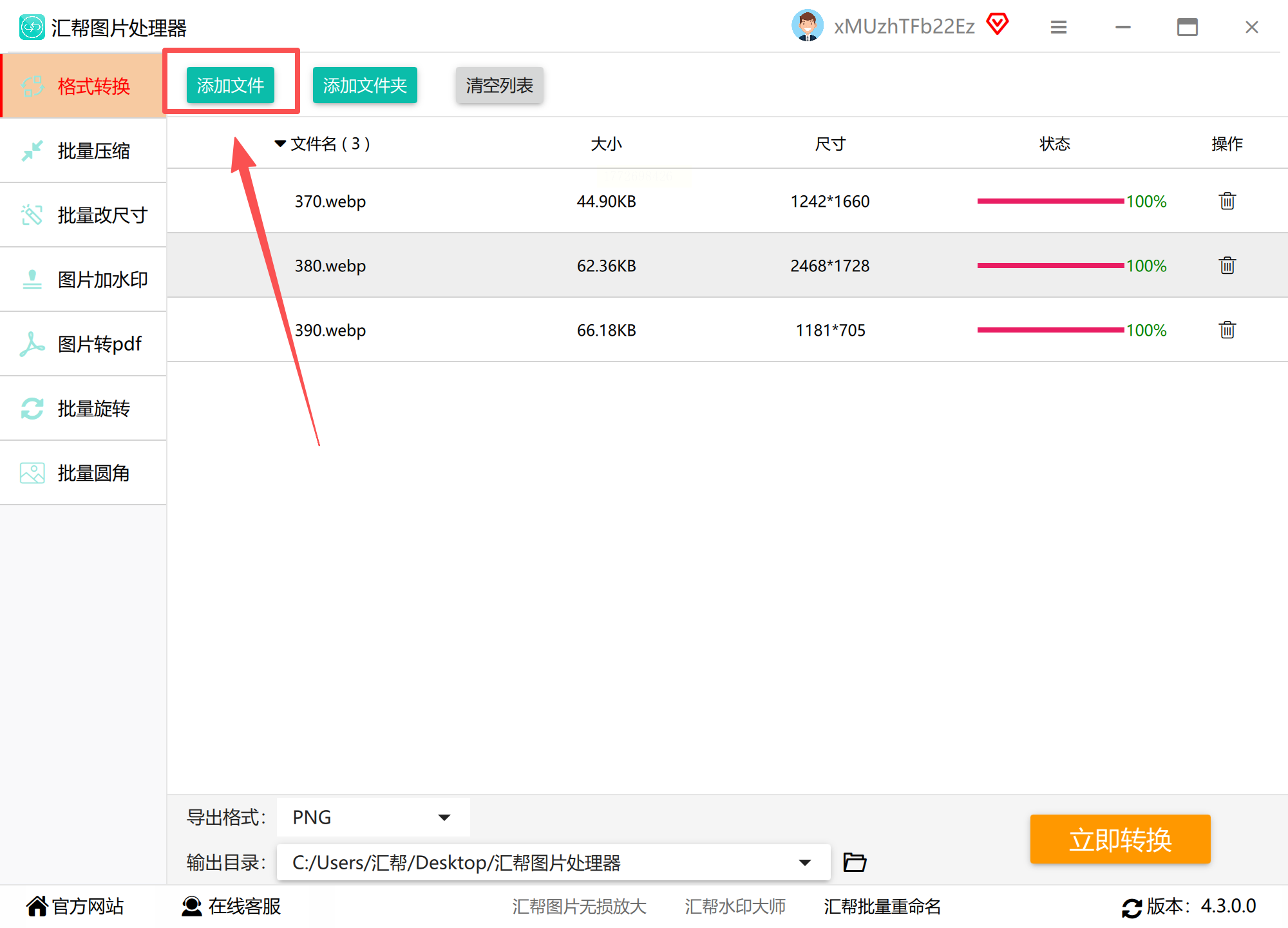1️⃣ 添加文件超方便:打开软件后点【添加文件】,文件夹里的图片能批量选中拖进去,不用一张张点(这点比单独打开软件省事多了!)