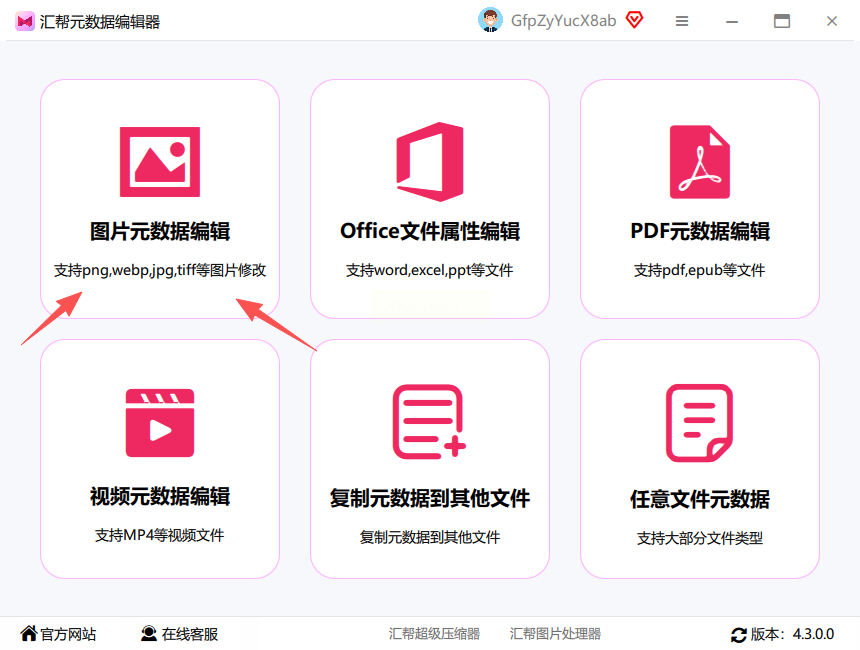 步骤一: 首先,你需要在电脑上安装并打开汇帮元数据编辑器软件。进入主界面后,你会看到“图片元数据编辑”这个核心功能选项,点击它进入下一步。