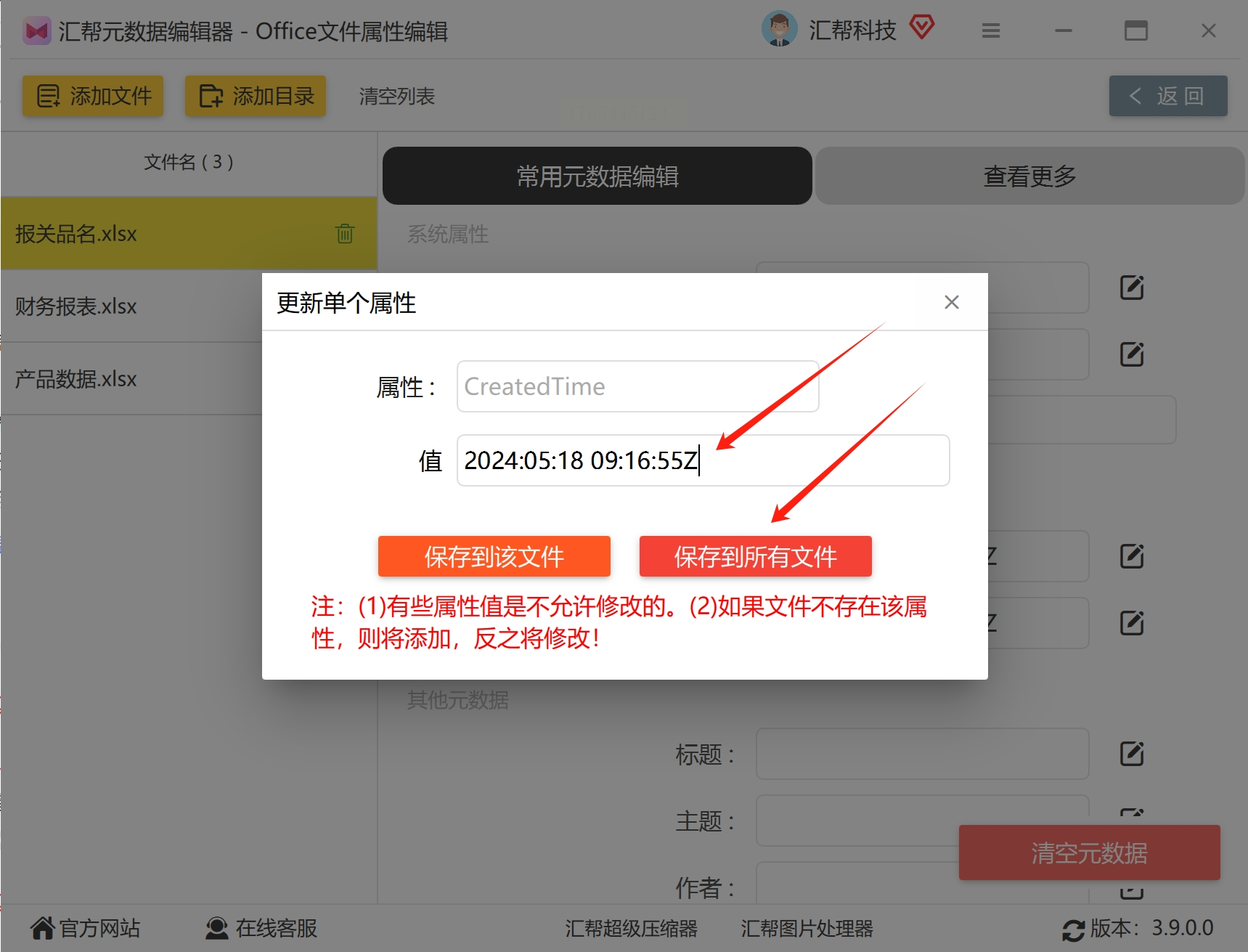 点击编辑按钮后,会弹出一个时间设置的小窗口。你可以在这里手动输入你想要的任何日期和时间,精确到秒。设置好后,注意看,不是点“确定”就完了!要点击 “保存到所有文件” 这个按钮。这样,你刚才设置的那个新时间,就会瞬间应用到列表里的所有文件上。软件会直接修改文件的源文件,不需要你额外导出,非常方便。