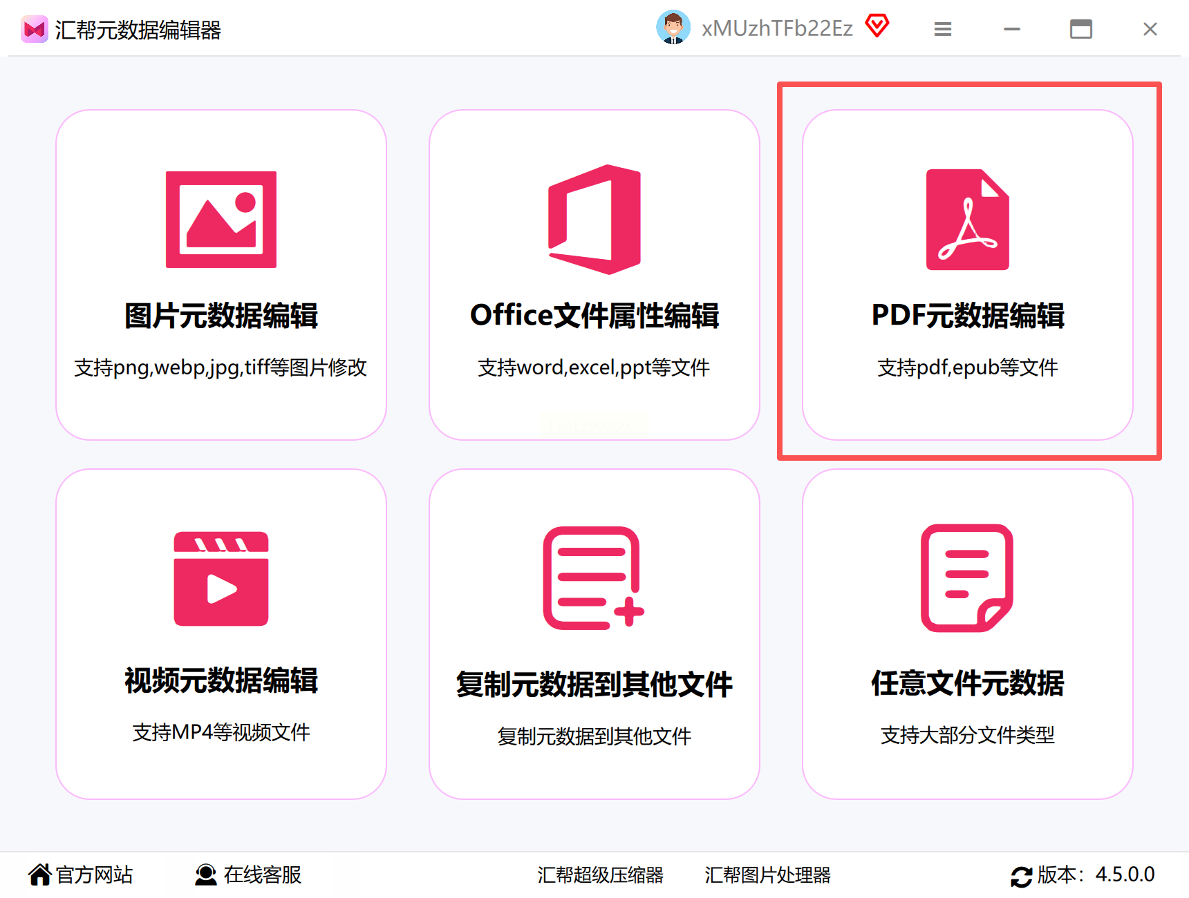 步骤一:启动软件后,在主界面选择“PDF元数据编辑”功能模块。该工具支持包括PDF、EPUB在内的多种电子书格式,具备专业的元数据处理能力。