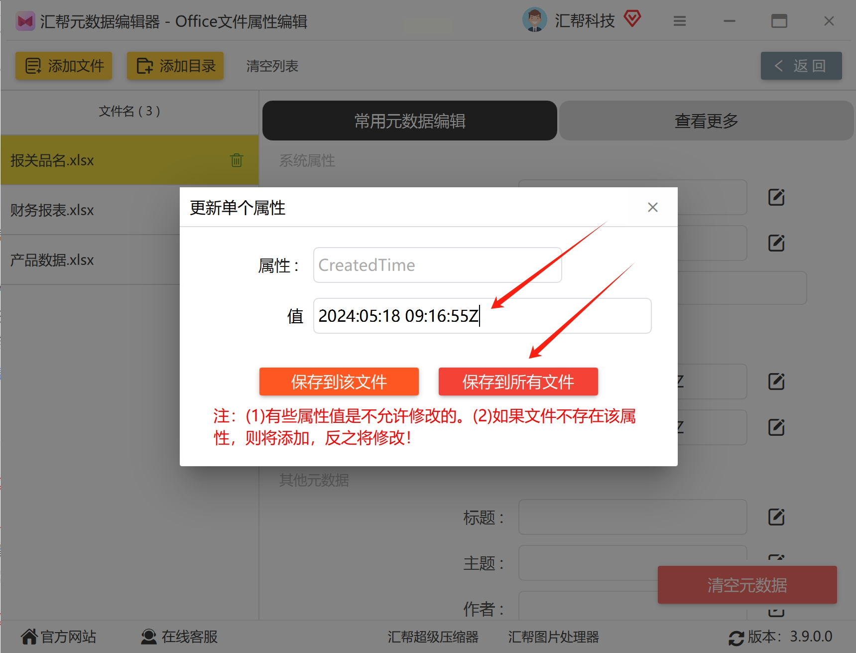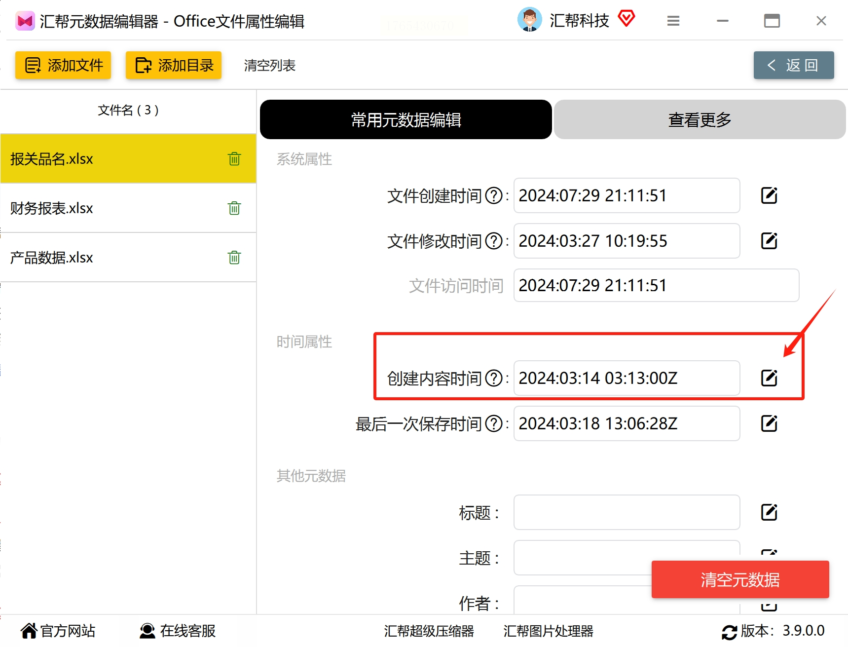 打开“汇帮元数据编辑器”,在主界面左侧功能栏中选择“Office文件属性编辑”模块(该模块支持Word、Excel、PPT等文档的元数据修改)。软件界面会显示文件类型分类,选择对应Office文件类型进入编辑界面。