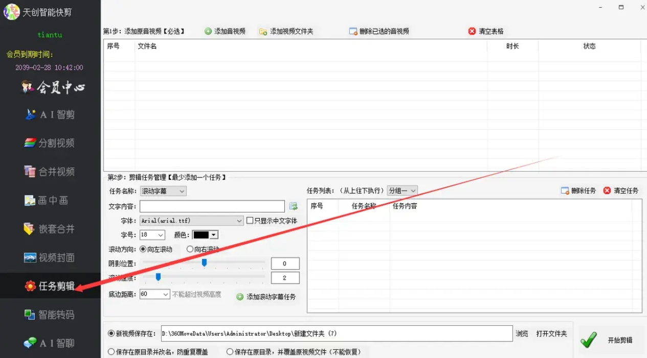 2. 进入剪辑页面:点击顶部的"任务剪辑"选项卡,这里是所有功能的入口。