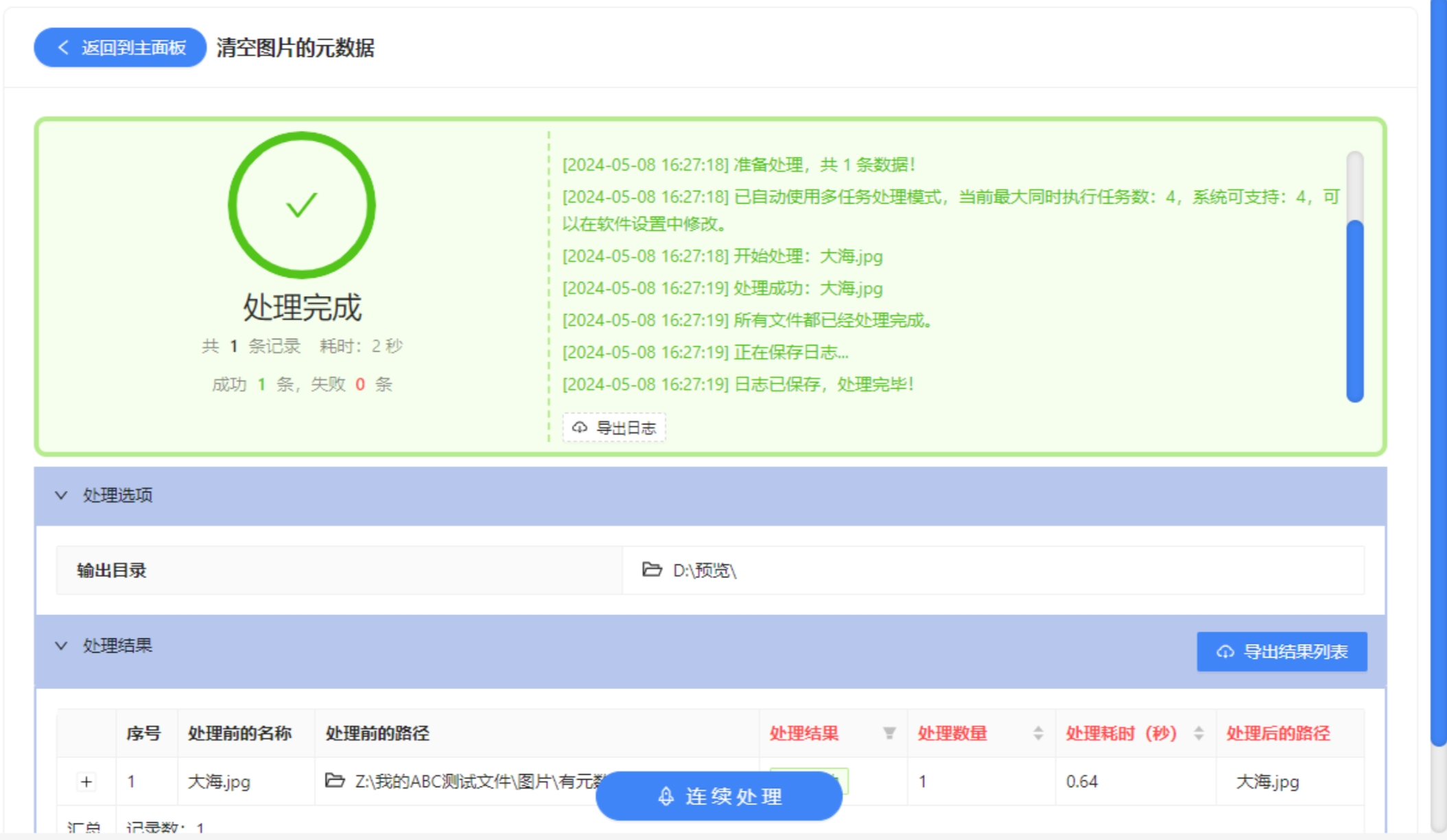 4. 点击“开始处理”或类似按钮,软件会自动清除图片中的元数据。处理完成后,通常会有绿色勾选或提示信息显示处理成功,此时就可以在之前设置的保存路径中找到处理后的图片。