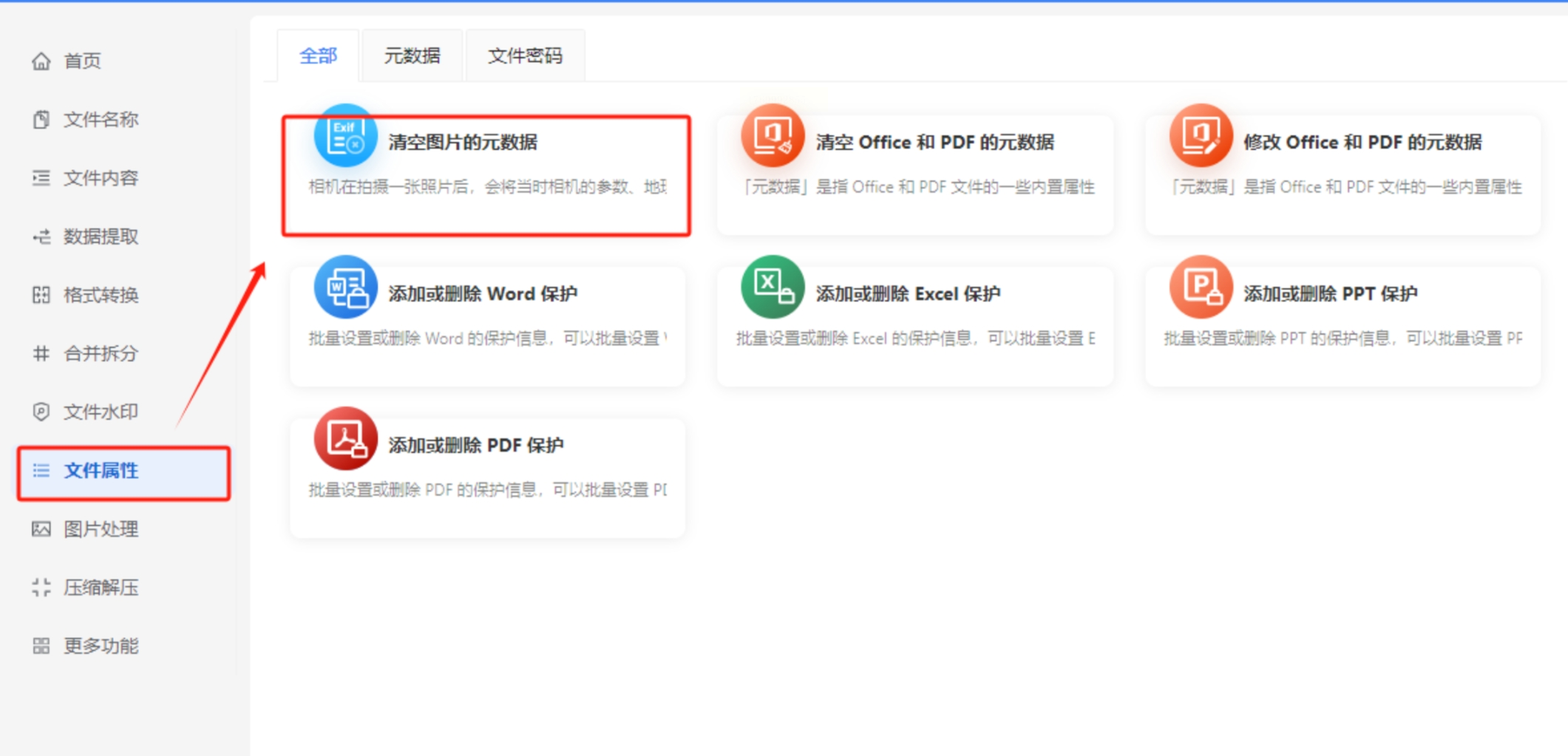 1. 打开办公软件工具箱,在左侧功能列表中找到“文件属性”或类似分类,点击进入后选择“清空图片的元数据”功能。