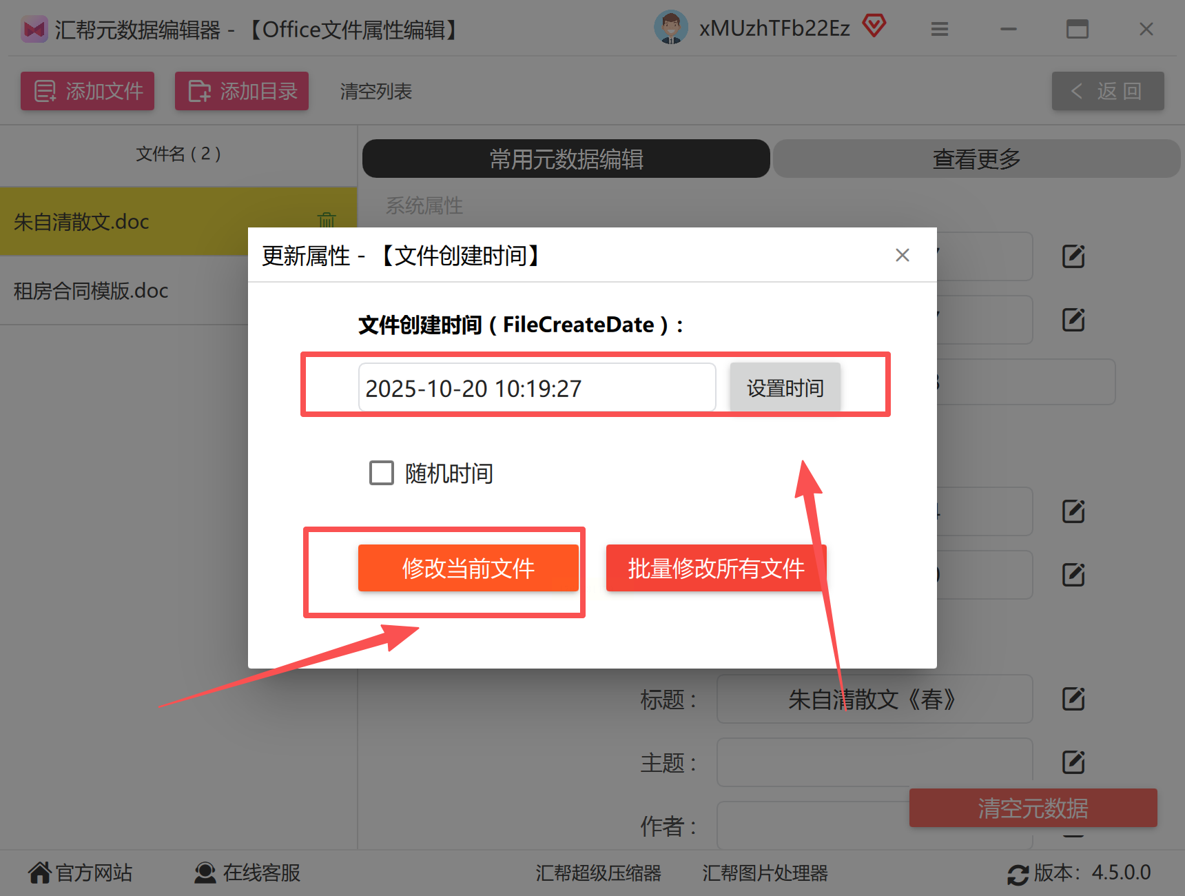 若需修改多个文档,可在文件列表中按住Ctrl键(或Ctrl+A全选)批量选中文件,在时间设置窗口完成统一调整后,点击软件底部的「修改当前/所有文件」按钮,系统会自动执行修改操作并显示进度提示。修改完成后,可通过「打开文件属性」功能再次核对创建时间,确保修改无误。