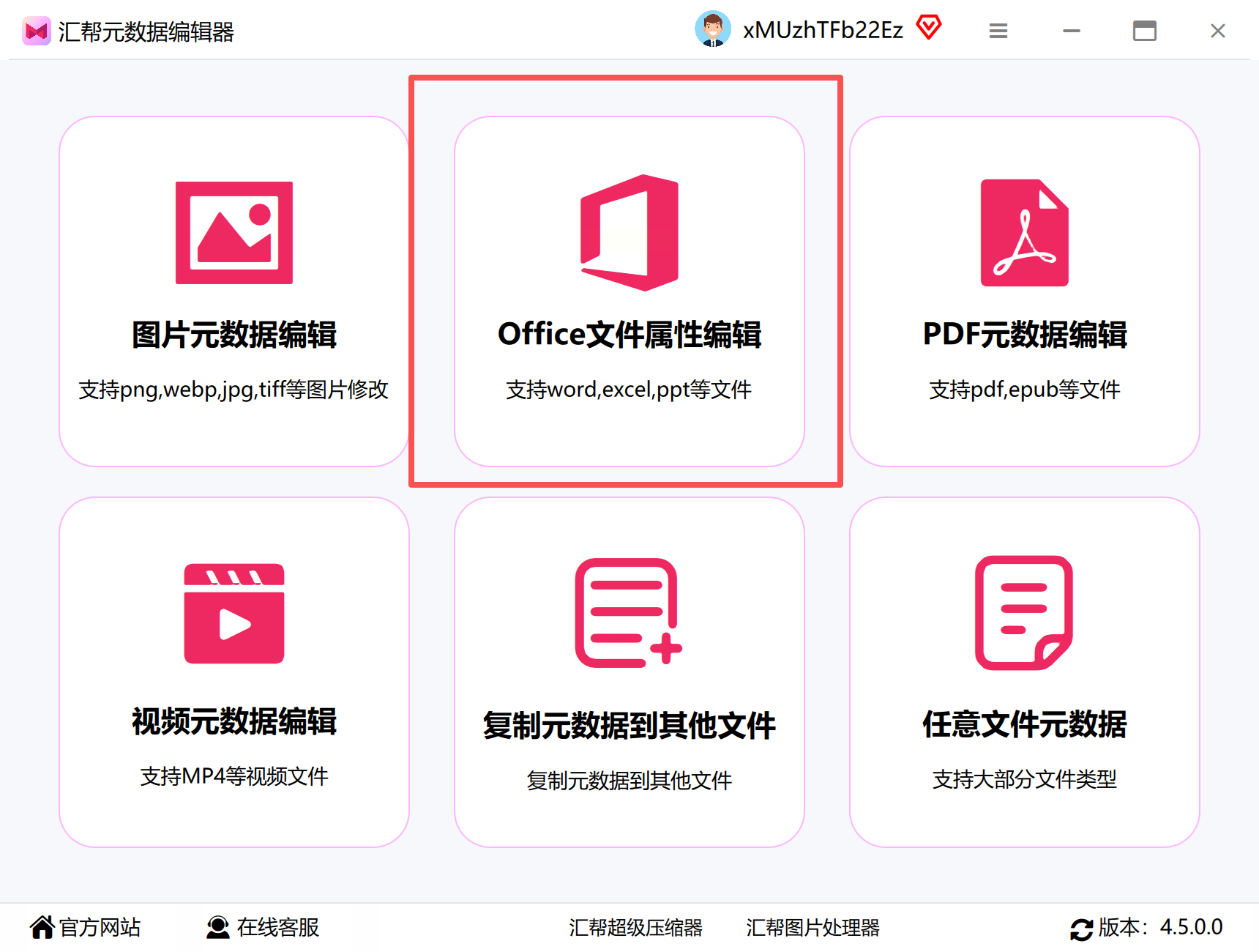 在主界面中找到「Office文件属性编辑」模块。该模块支持对Word、Excel、PPT等Microsoft Office系列文件进行元数据修改,界面采用直观的分类导航,左侧清晰列出文件类型,右侧则是属性编辑区域,即使初次使用也能快速上手。