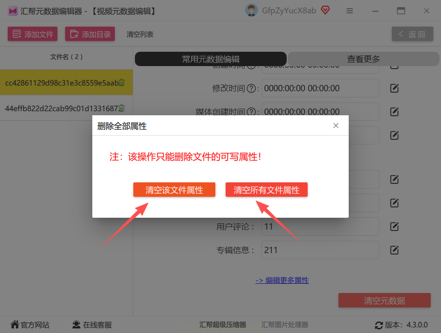 步骤六: 点击后,软件会弹出一个提示窗口。这个设计很贴心,是为了防止误操作。它会让你做出选择:是只清空当前正在查看的这个文件的元数据,还是清空本次上传的所有文件的元数据。你可以根据自己的实际需求来选择。