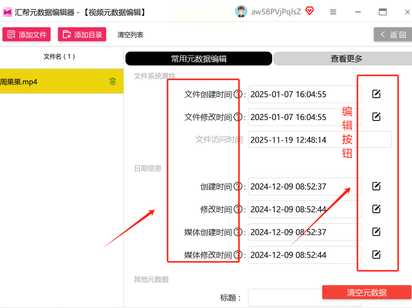 步骤三:在软件右侧的信息显示区域,找到需要修改的元数据字段。这些字段包括创建日期、作者信息、版权声明、视频描述等。找到目标字段后,点击旁边的“编辑”按钮,按钮通常显示为铅笔图标或者明确的“编辑”文字标识。