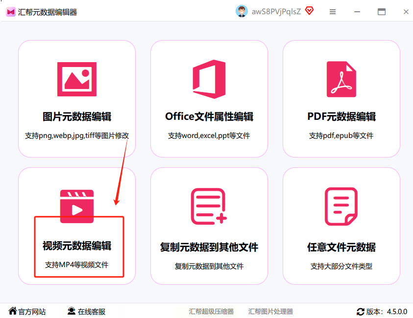步骤一:启动软件后,你会看到一个功能分区明确的主界面。在这里找到并点击“视频元数据编辑”模块,这个选项通常位于界面左侧的功能列表或者顶部的菜单栏中。