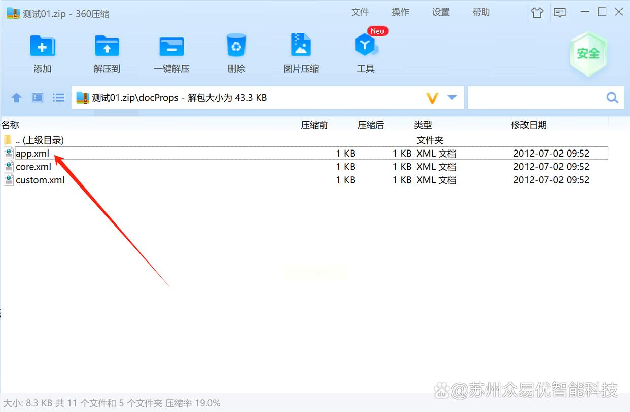 2. 解压压缩包:用你电脑里的解压软件打开这个压缩包,比如WinRAR或者7-Zip都行。打开之后你会看到里面有好多文件夹和文件,找到“docProps”这个文件夹,里面有个叫“app.xml”的文件,这个文件就是记录Word的属性信息的。