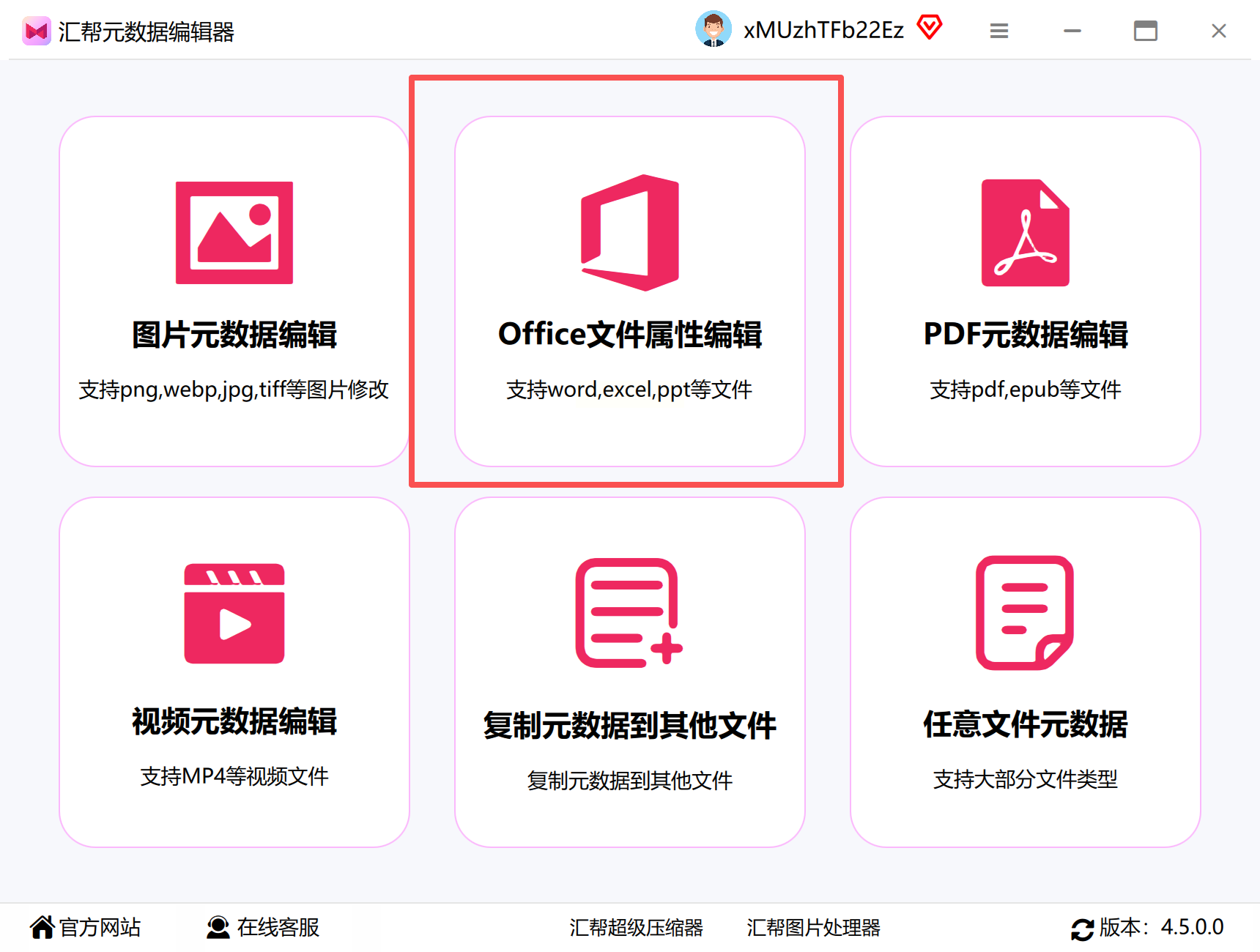 步骤一:启动汇帮元数据编辑器,在主界面选择“Office文件属性编辑”功能,进入操作面板。