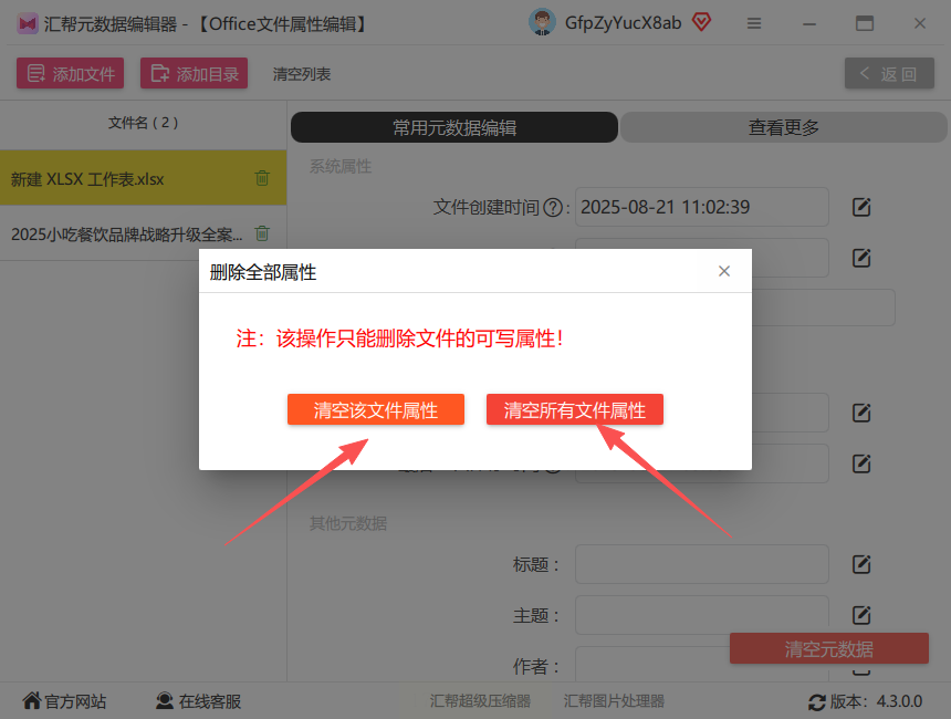 步骤四:点击按钮后会弹出操作确认窗口,选择"清除当前文件"或"清除选中所有文件"。这里要注意,如果需要保留某些特定信息(比如创建日期但清除作者),软件支持单独勾选元数据项,比全选更灵活。