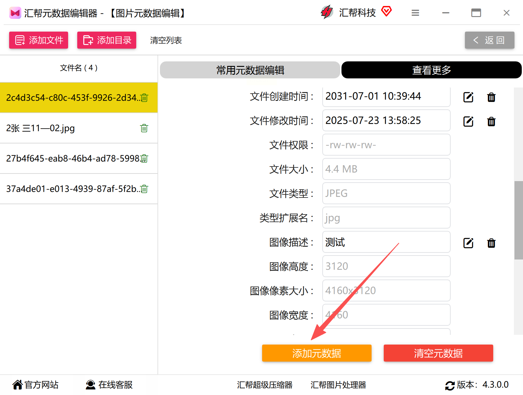 首先确保电脑已安装汇帮元数据编辑器,双击启动后选择"图片元数据编辑"功能。该界面采用中文交互设计,适合非技术用户操作。