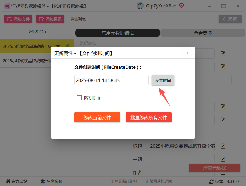 打开汇帮元数据编辑器后,在主界面找到"PDF元数据编辑"选项(注意:软件中"PDF"是通用的元数据编辑模块,支持多种格式文件的元数据修改),点击进入编辑界面。