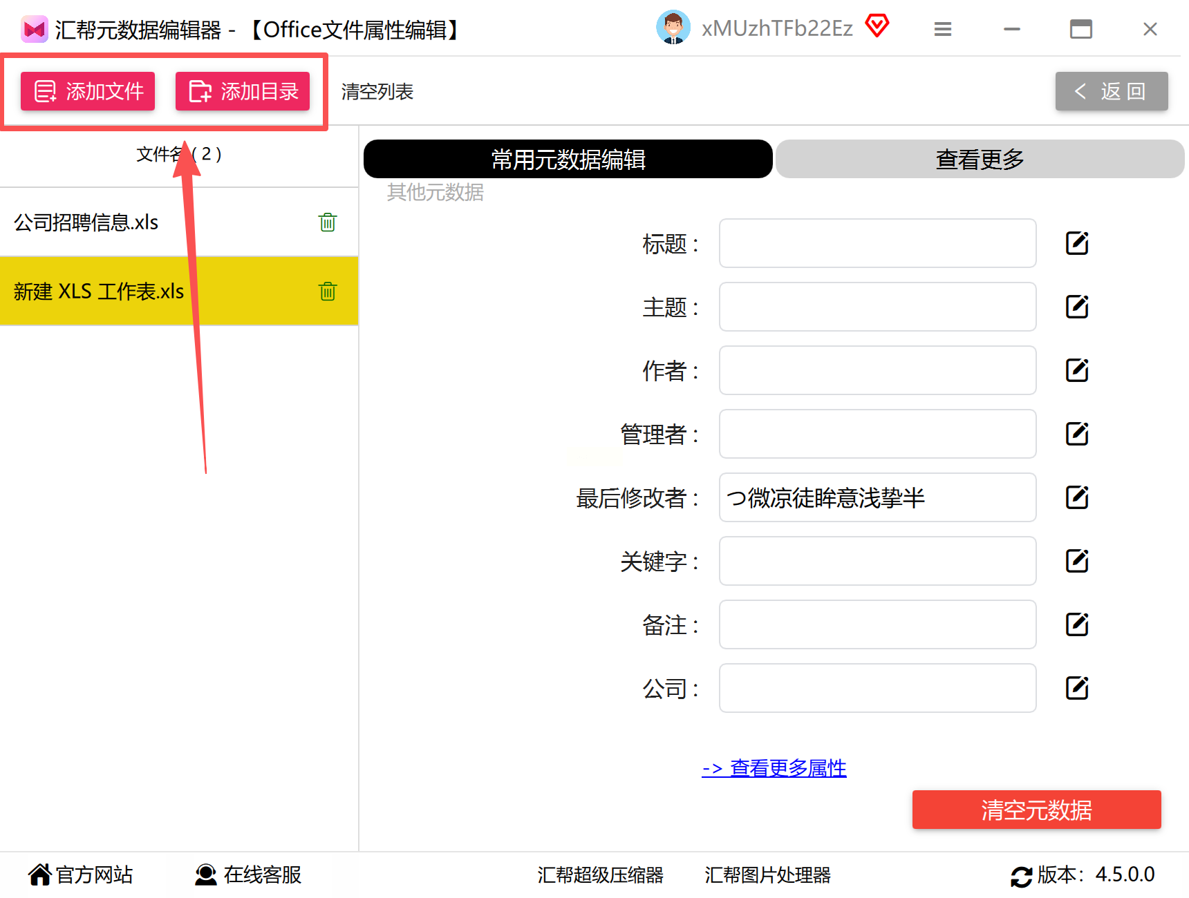 点击界面中央的"添加文件"按钮,或直接将Excel文件拖拽至软件操作区,系统会自动识别文件类型并加载元数据信息。若需修改多个文件,可通过"批量导入"功能一次性添加文件夹内所有Excel文件。