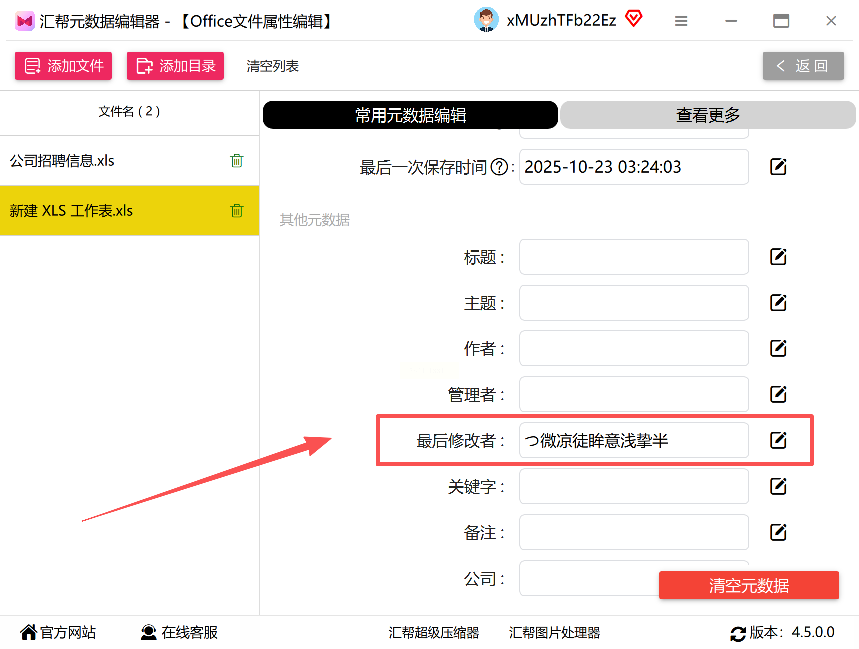 3. 在文件元数据列表中找到"最后修改者"或"Modified By"字段,输入新名称。