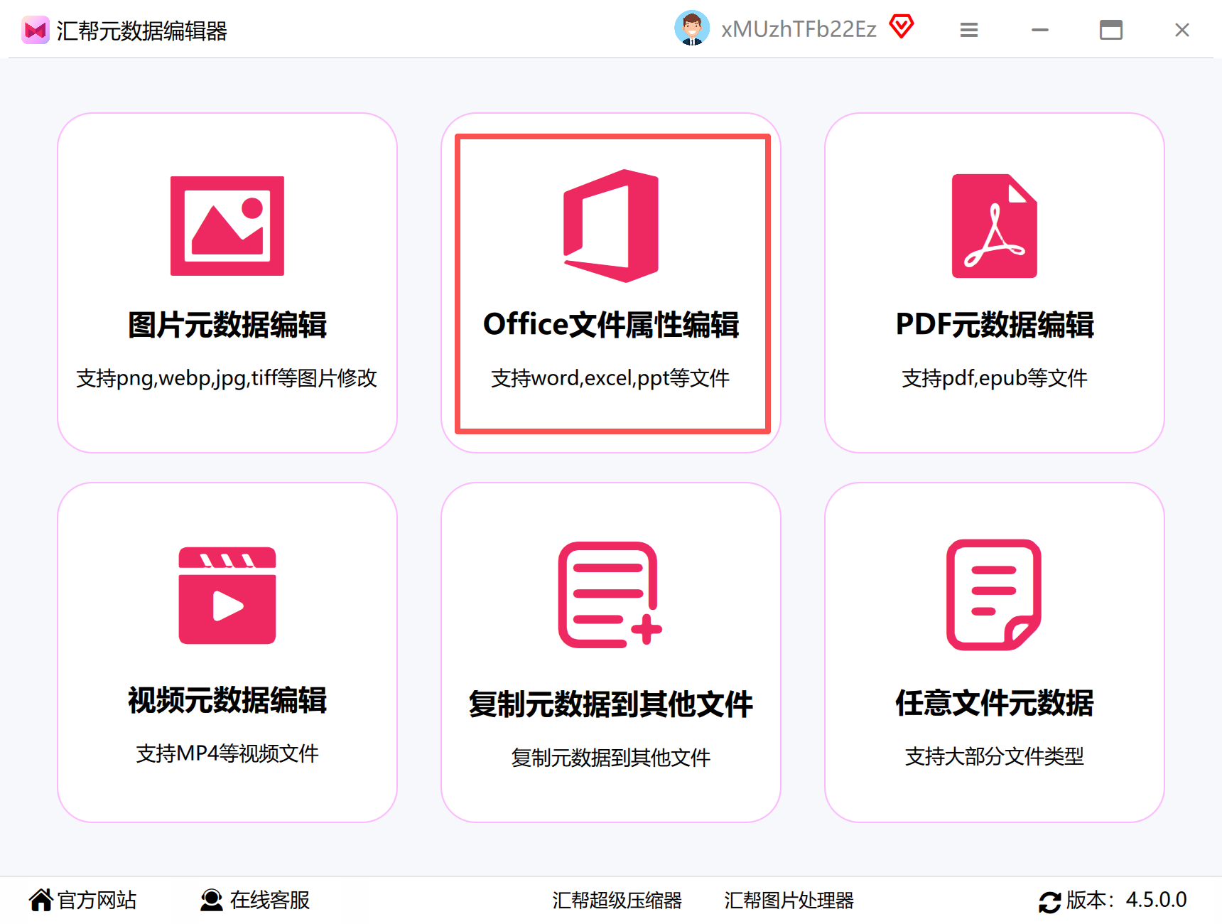 打开汇帮元数据编辑器后,在主界面左侧功能区选择"Office属性编辑"模块,该模块支持对Word、Excel等常见Office文件的元数据进行批量或单文件修改。