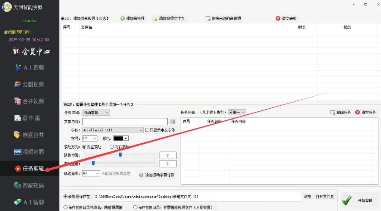 在主界面顶部菜单栏,有个很显眼的"任务剪辑"标签,点它就对了。