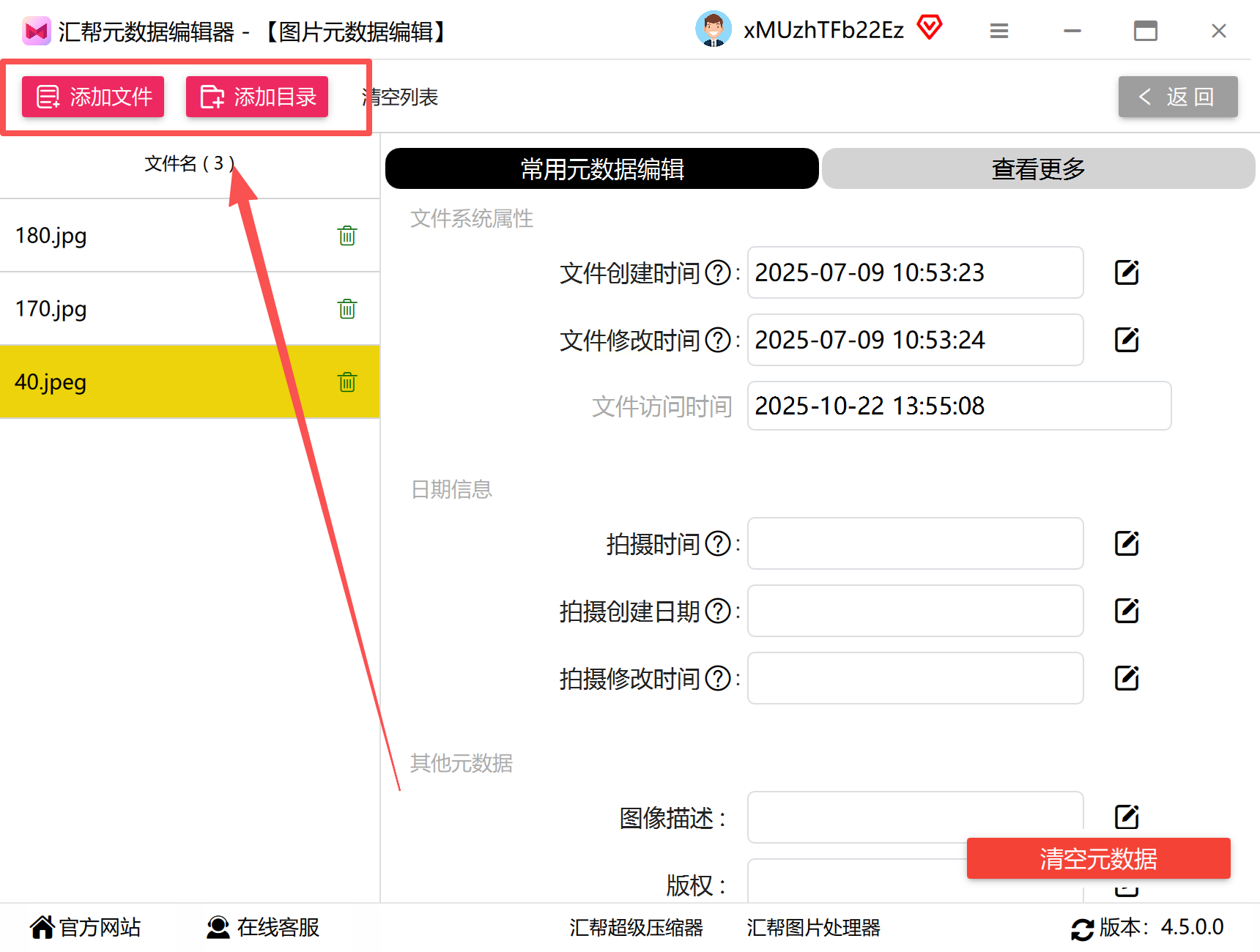 打开汇帮元数据编辑器后,在主界面左侧功能区选择"图片数据编辑"模块。该界面采用简洁的四栏布局:左侧文件列表区、中间预览区、右侧元数据编辑区及底部操作栏,清晰呈现各功能节点。