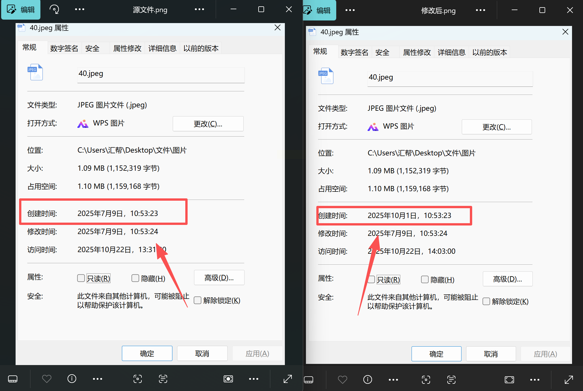 - 再次打开文件属性窗口查看"详细信息"中的创建时间;