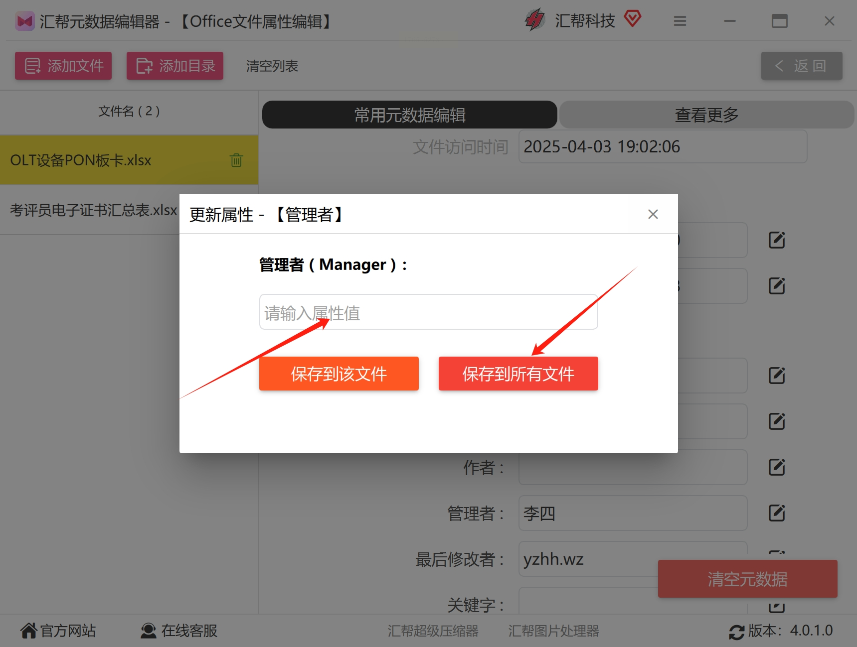 在弹出的编辑框里,你会看到当前填写的属性值(可能就是你的名字或电脑用户名)。我们的目的就是删除它,所以直接用键盘删除键将框内的文字清空,让它变成空白。然后,点击最关键的 “保存到所有文件” 按钮。这里请注意:这个操作是直接修改原始文件,而不是另存为一个新文件。所以效果是即时的,也无需后续再导出。