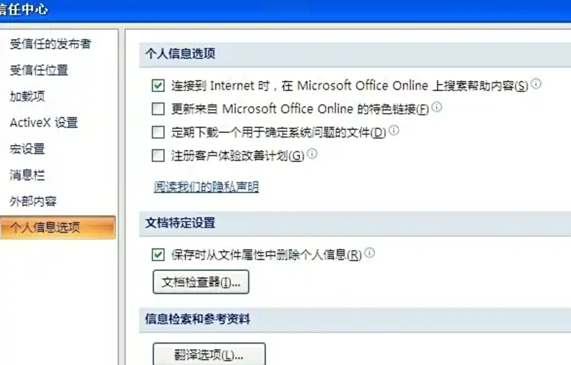 这会打开另一个名为“信任中心”的窗口。在左侧列表中,找到 “个人信息选项” 并点击。现在,请看右侧的主要设置区域,这里有一个关键选项: