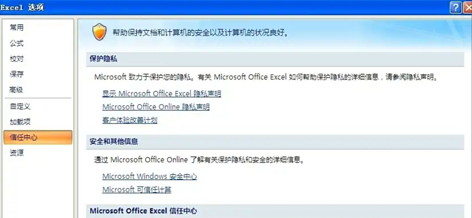 在“Excel选项”对话框的左侧,找到并点击 “信任中心” 这一分类。然后在右侧的面板中,你会看到一个 “信任中心设置...” 的按钮,点击它。