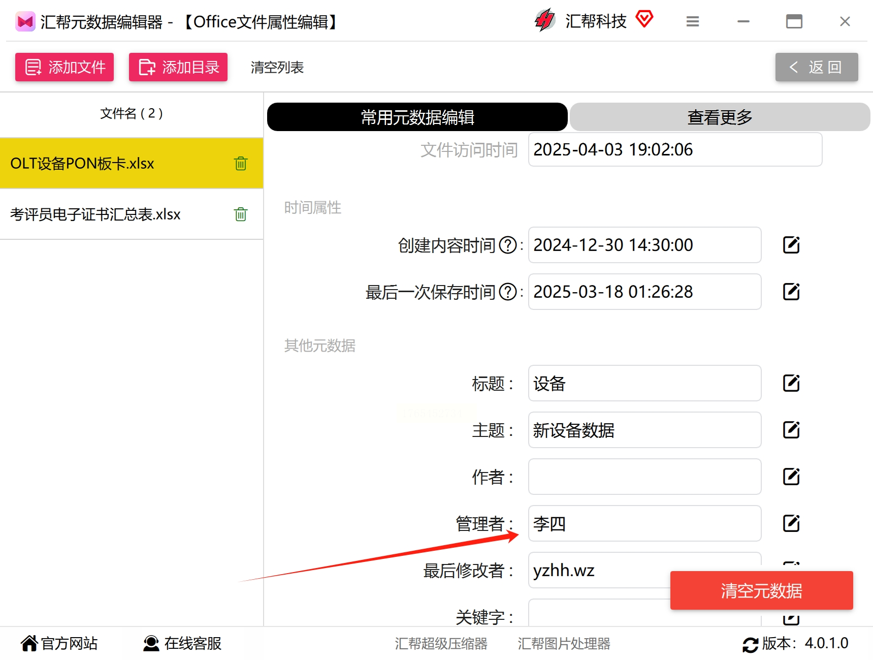 文件添加成功后,在软件界面找到 “常用元数据编辑” 这个选项并选中它。下面会立刻列出这个文件包含的所有属性信息,比如创建时间、修改时间、标题、主题、作者(Author)、管理者(Manager)等等。我们要找的目标就是 “管理者” 这一项(有时“编辑者”信息也储存在“作者”项,你可以都检查一下)。找到后,点击它右侧的 “编辑” 按钮,会弹出一个小的编辑窗口。