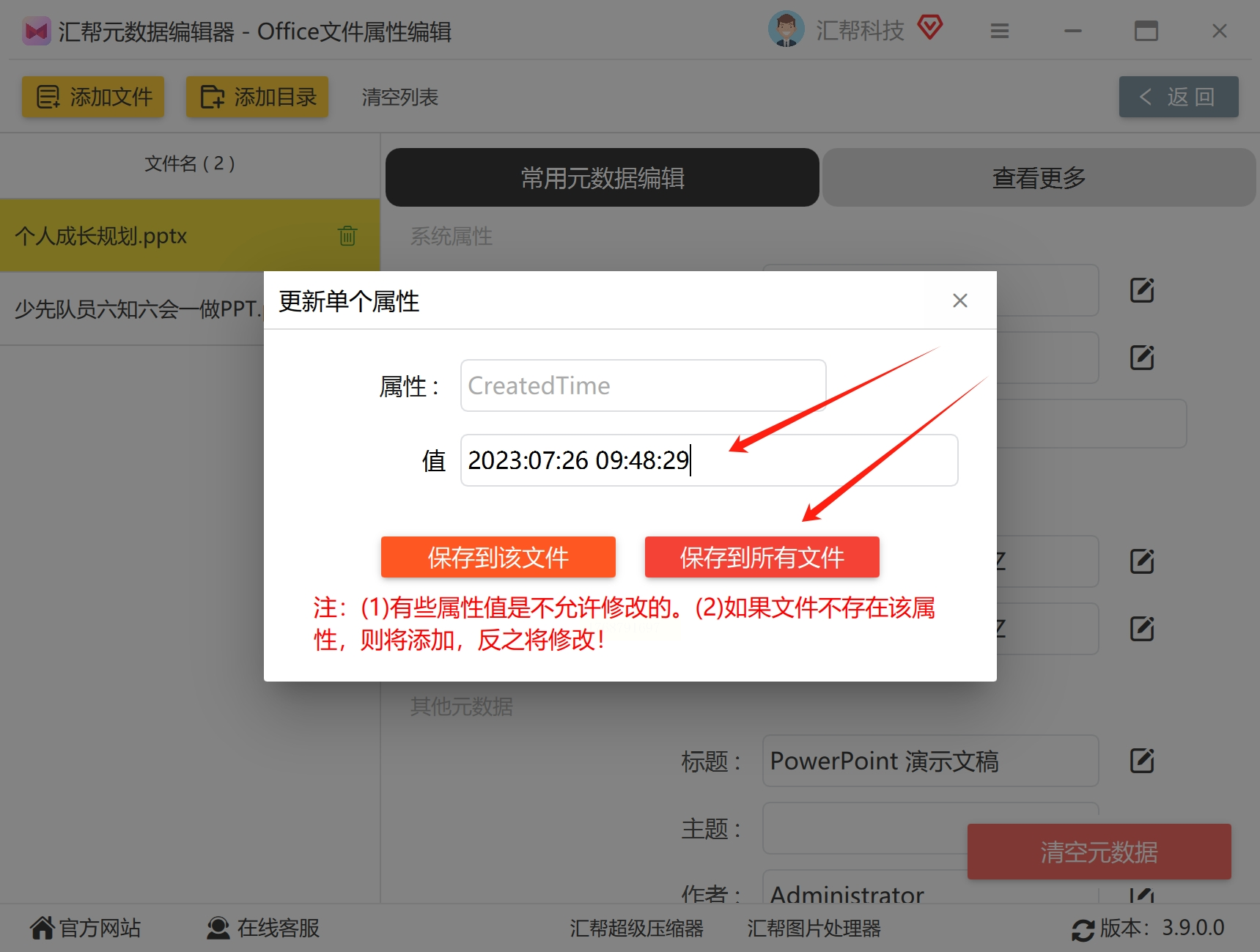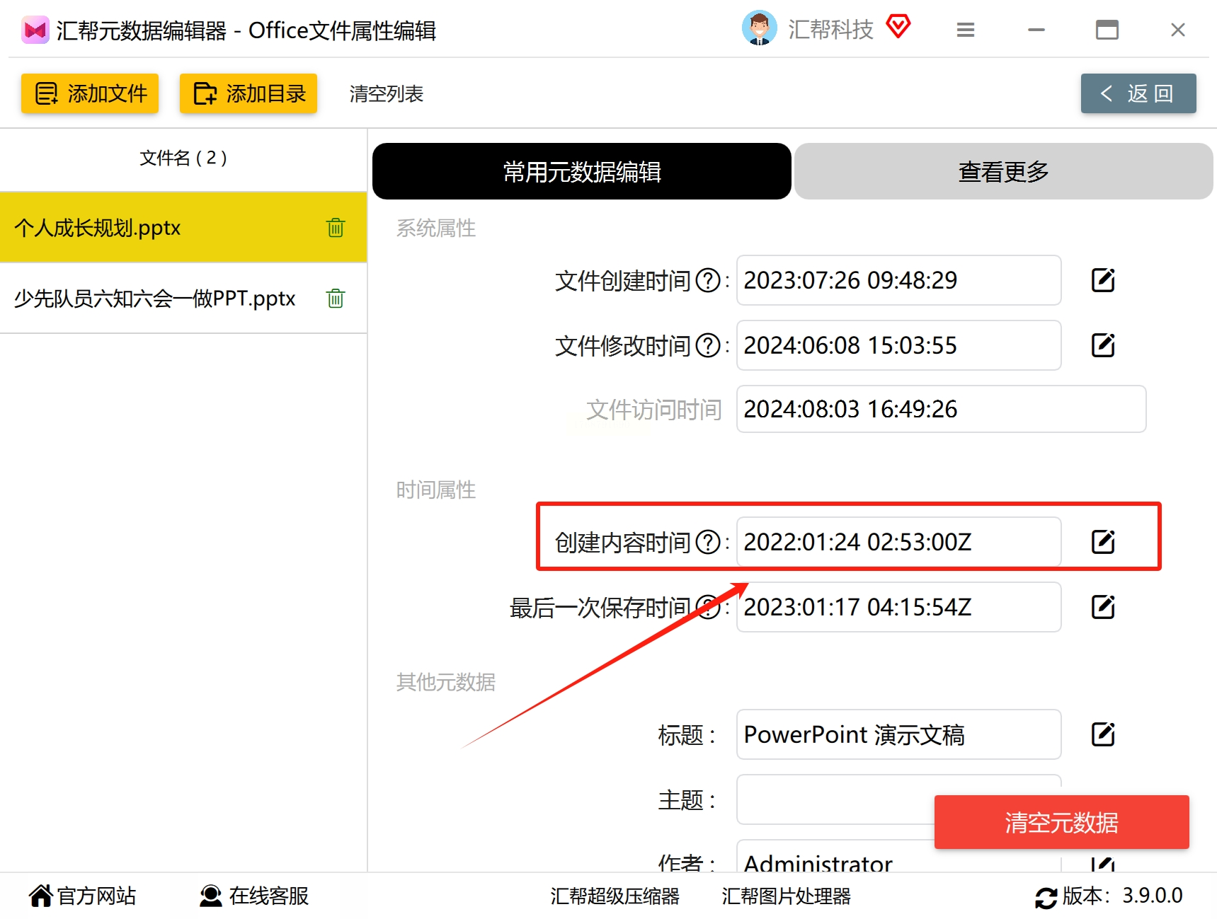 文件导入后,软件会自动读取现有元数据。你可以在属性框中直接修改创建时间等内容。如果某些项目不需要修改,可以留空。