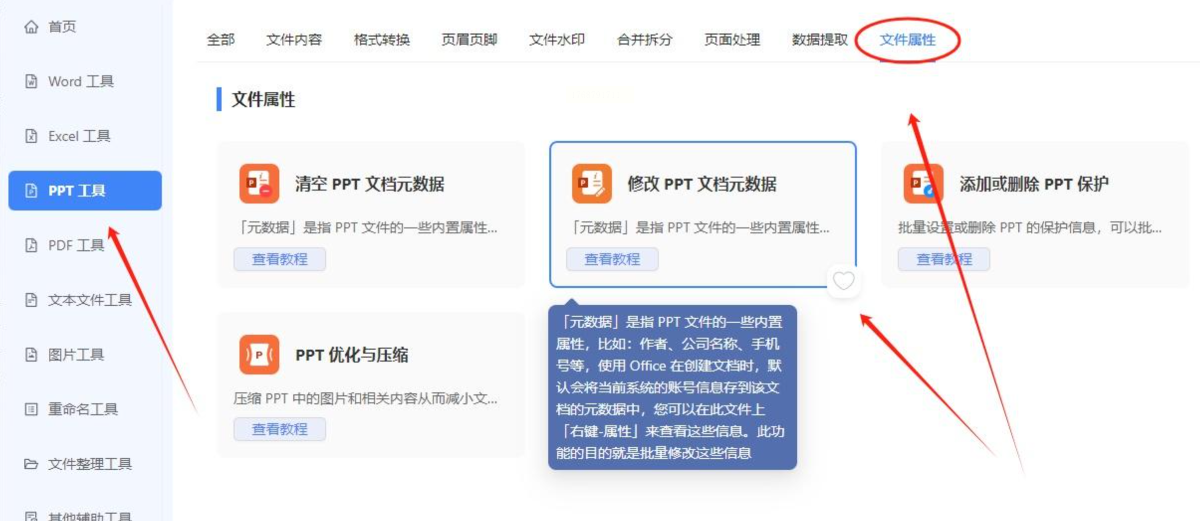 启动鹰讯批量处理工具箱后,在左侧菜单栏选择“PPT工具”,然后在右侧功能列表中找到“修改PPT文档元数据”选项。