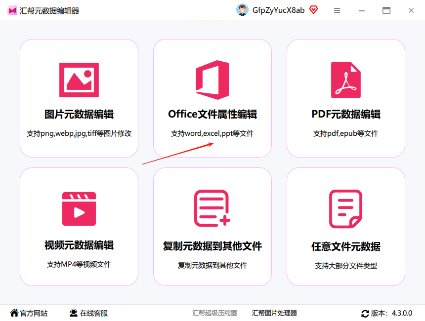 步骤一: 首先,你需要在电脑上打开汇帮元数据编辑器。启动之后,在主界面上找到并点击“Office文件属性编辑”这个功能选项。