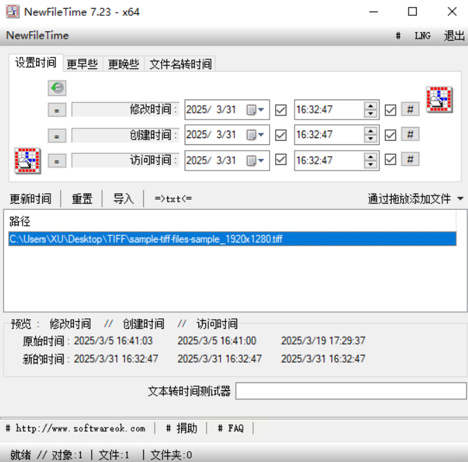 * NewFileTime:这款工具非常轻巧,它在批量修改方面很强,可以同时修改创建、修改、访问三种时间,并且能精确到秒。操作界面是英文的,但功能按钮很直观。