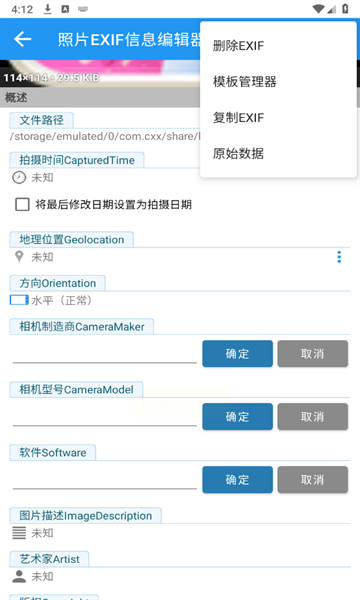 4. 编辑信息: 每个信息下面都有一个输入框,你可以直接在输入框中输入你想要的数据,点击“确定”按钮,就相当于修改了原图片的的信息。这个软件还支持删除和复制EXIF信息,功能强大!