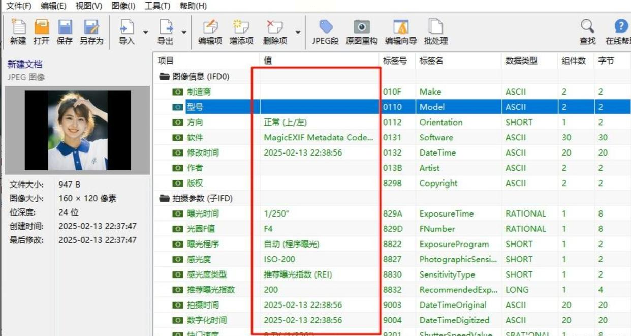 6. 参数调整: 双击每一行参数,对 EXIF 信息做适当调整。这里有个小窍门,仅修改部分参数,能让图片更接近真实原图的状态。