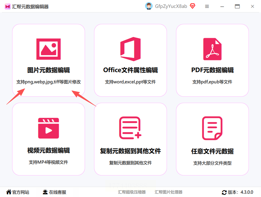 1. 打开汇帮元数据编辑器,在主界面选择"图片元数据编辑"选项进入功能模块。