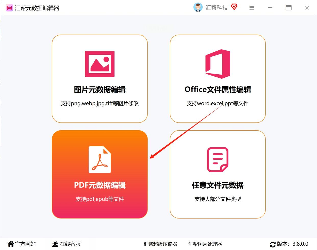 先双击桌面上的"汇帮元数据编辑器"图标启动软件,进入主界面后,在顶部菜单栏找到"PDF元数据编辑"选项卡,点击进入元数据管理界面。