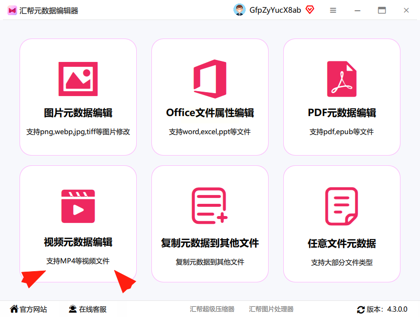 步骤一:首先,在你的电脑上下载并安装汇帮元数据编辑器。完成安装后,启动软件。在软件的主界面上,你会看到多个功能选项,请找到并选择“视频元数据编辑”这个模块。