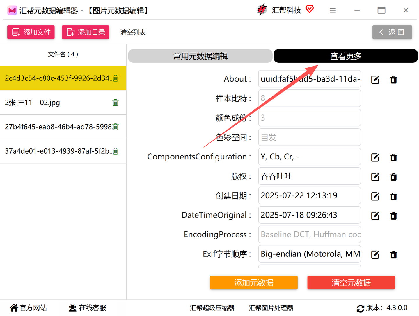 步骤3:图片导入后界面中会列出很多图片的元数据信息,包含创建时间,修改时间,拍摄时间等信息。此时我们点击“查看更多”选项,在下面寻找经纬度信息,如果界面上没有的话就代表原先就没有经纬度信息。