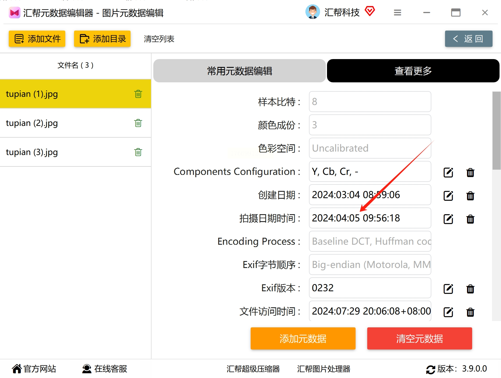 照片添加成功后,软件会自动把照片里藏着的所有信息(就是元数据)展示出来。你别被那些专业术语吓到,咱们只关心一个。在“常用元数据”这个分类下面,仔细找“拍摄创建日期”这一项。对,就是它,记录拍照时间的关键。