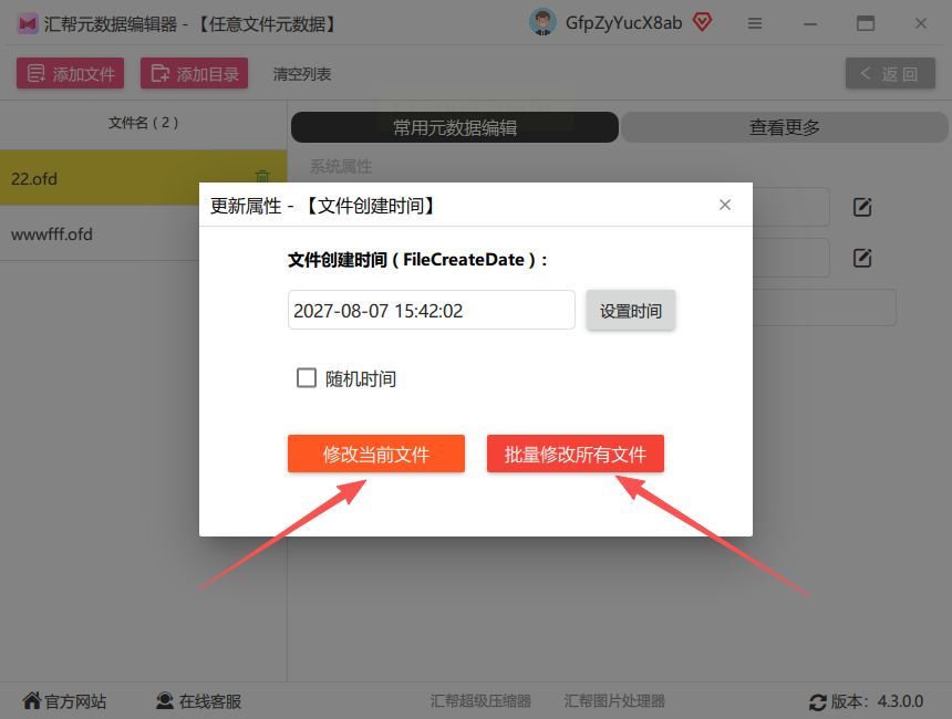 步骤五:点击“设置时间”按钮确认修改,然后软件会提示你选择“修改当前文件”或“修改所有文件”。根据需求选择,例如只修改当前文件以避免误操作。