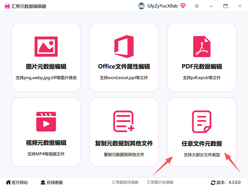 步骤一:下载并打开汇帮元数据编辑器。在软件主界面,找到并点击“任意文件元数据”这个功能选项。