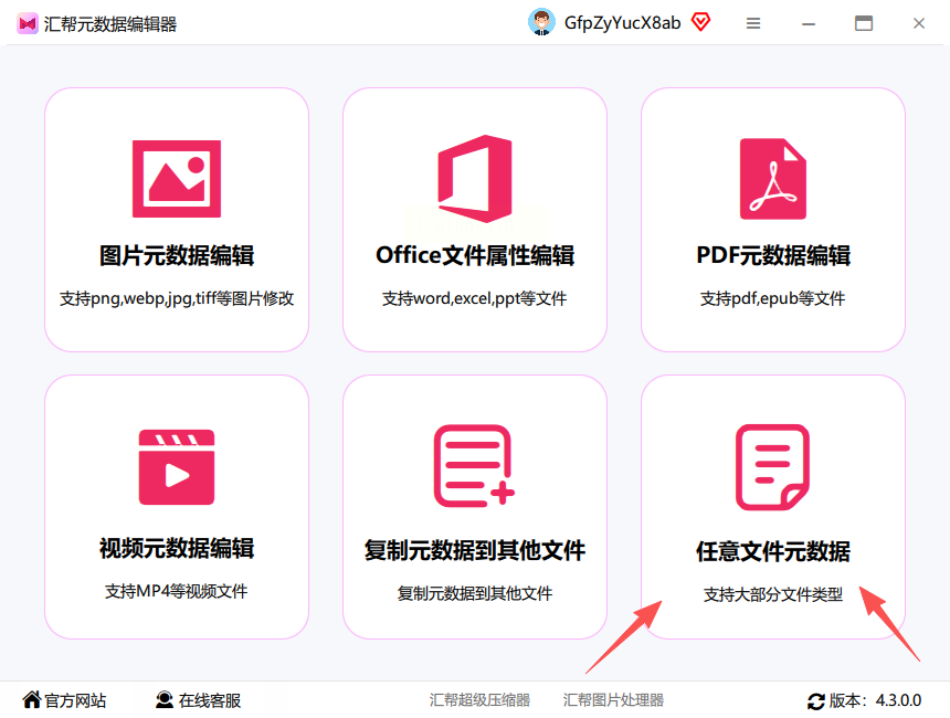 步骤一:下载并打开汇帮元数据编辑器,在界面上找到“任意文件元数据”选项并点击。