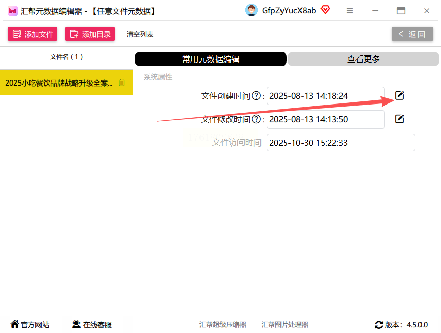 打开汇帮元数据编辑器后,点击主界面的"任意文件元数据编辑"功能按钮。这个功能设计很直观,无需复杂配置,直接进入文件属性修改界面。