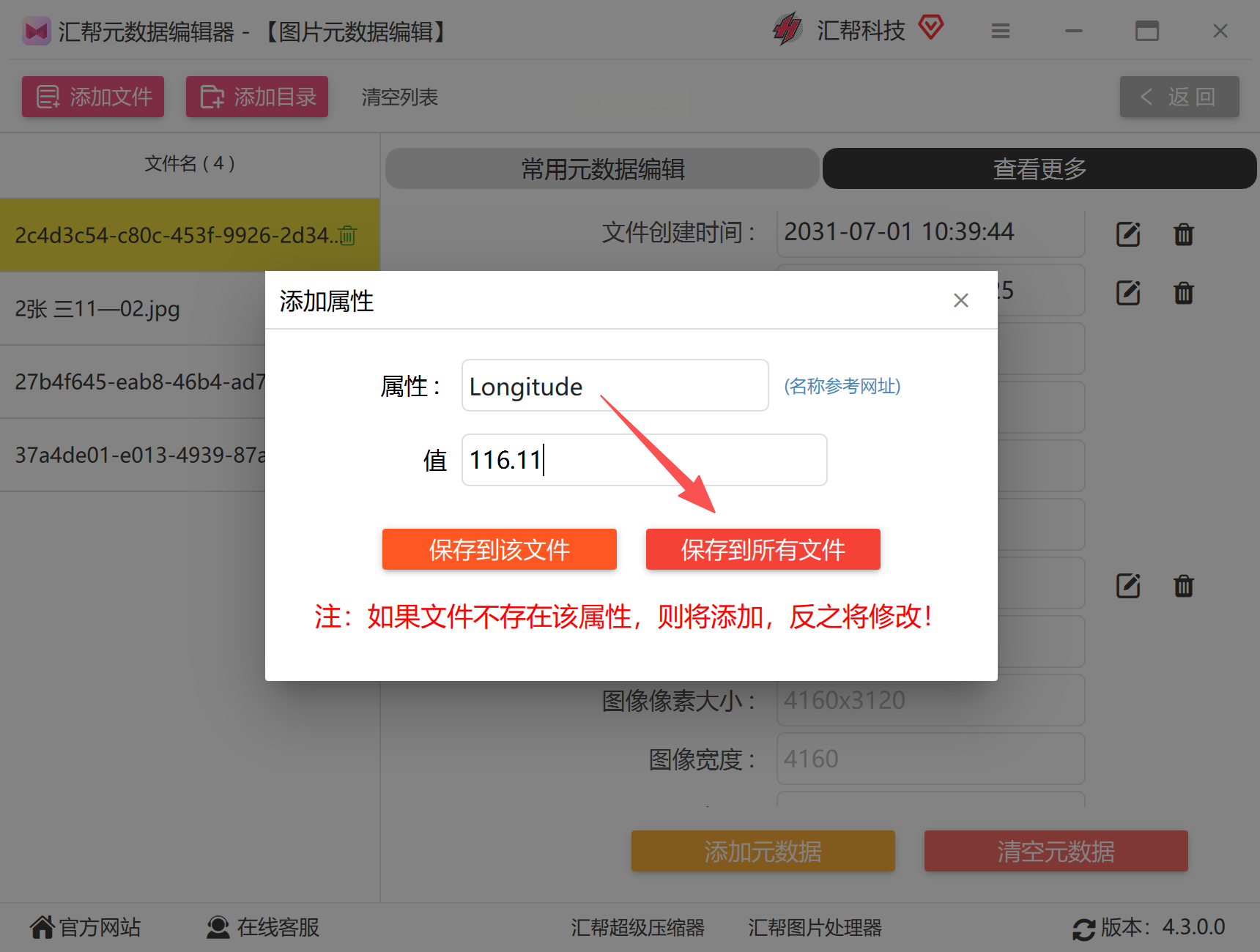 8. 应用并保存:填写好经纬度值后,点击【确定】或【保存】。返回主界面后,为了将信息真正写入图片文件,请务必点击【保存到所有文件】或类似的最终应用按钮。处理完成后,你可以直接在软件里刷新查看,对应的经纬度字段应该已经填上了你输入的信息。
