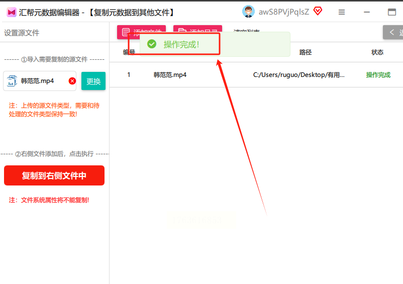 步骤4:执行复制操作。现在,源文件和目标文件都就位了,点击“复制到右侧文件中”按钮。软件会自动将左侧源视频的元数据应用到右侧的所有目标视频中。这个过程可能需要几秒钟,取决于文件大小和数量,耐心等待进度条完成。